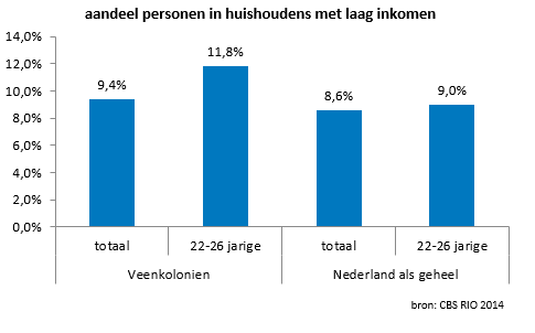 In de Veenkoloniën moest in 2014 bijna één op de tien personen rondkomen van een laag inkomen. Naar verhouding hebben meer jongvolwassenen een hoog risico op armoede (11,8%). Dit is exclusief studentenhuishoudens. Dat aandeel is hoger dan in Nederland waar 9% van de jongvolwassenen in armoede leefden.